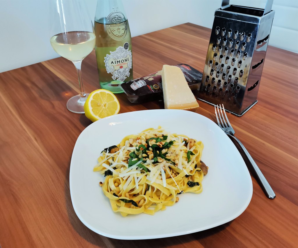Lecker aromatische Steinpilze, würziger Bärlauch, frische Zitrone, knackige Pinienkerne und dazu intensiver Parmesan. Abgerundet mit einem guten Schluck Weißwein ergibt sich hieraus eine unschlagbare Kombination.