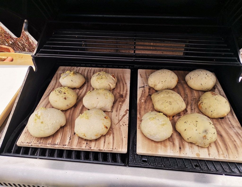 Jetzt geht es auf den Grill. Hierfür den Pizzastein auf den Grill geben und diesen für ca. 15 Minuten auf 260°C vorheizen. So wird der Pizzastein schön heiß. Die Grillbrote nun mit der gefalteten Seite nach unten auf den Pizzastein legen und den Deckel des Grills schließen. Die Temperatur sollte hierbei weiterhin zwischen 250-260°C gehalten werden. Nach etwa 10 Minuten werden die Grillbrote gedreht, sodass die Oberseite ebenfalls für 5 Minuten gebacken wird, auch hierbei den Deckel geschlossen halten. Anschließend können die Grillbrote auch schon serviert werden. Am besten schmecken die Brote heiß und frisch vom Grill. Sollte etwas übrig bleiben packt es einfach nochmal kurz in den Ofen um es warm zu genießen.