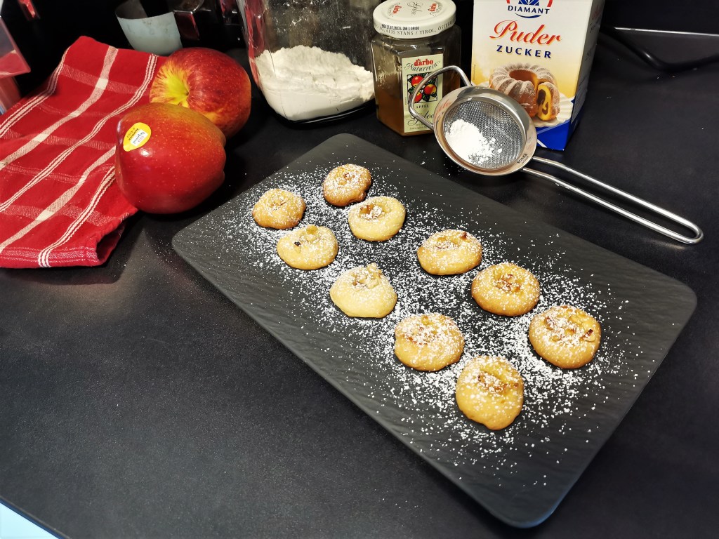 Normalerweise kenne ich Engelsaugen von meiner Oma gebacken mit Erdbeermarmelade und einem recht simplen, mit leichter Vanillenote abgerundeten Teig. Aber man kann die Engelsaugen auch prima in eine Bratapfelvariante verwandeln. Wie das geht? Der Teig wird mit etwas Zimt verfeinert, die Mulden der Engelsaugen mit Apfelmarmelade gefüllt und getoppt mit gehackten, gerösteten Haselnüssen. Simpel und unfassbar lecker! Der große Vorteil den Engelsaugen beiten: Der Teig muss nicht, wie bei vielen anderen Plätzchensorten, erst kühl lagern bevor man ihn verarbeiten kann. Das heißt sobald ihr den Teig fertig geknetet habt könnt ihr auch schon die Plätzchen daraus zaubern.