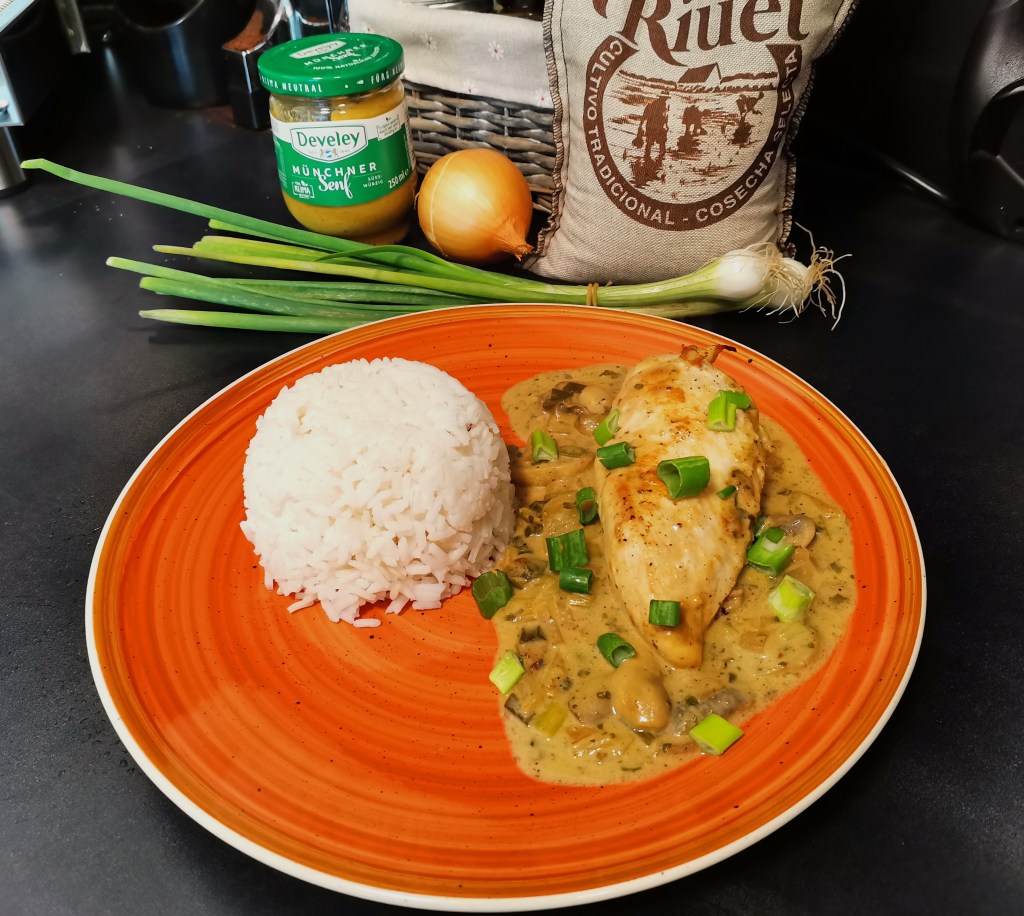 Nochmal ein wenig Öl in der Form erhitzen und darin die Champignons und die Zwiebel anbraten, bis die Zwiebel glasig ist. Die Frühlingszwiebel dazu geben und für 1 Minuten mit braten. Das Gemüse mit dem Wein ablöschen und diesen ca. 5 Minuten einkochen lassen. Senf, Honig und Sahne einrühren. Das Ganze mit Salz, Pfeffer und Cayenne Pfeffer abschmecken. Sollte sie Sauce zu dünn sein, das Mehl in etwas Wasser einrühren -aufpassen das keine Klümpchen entstehen- und die Mischung in die Sauce geben. Diese dann nochmal aufkochen lassen und schon dickt die Sauce an.