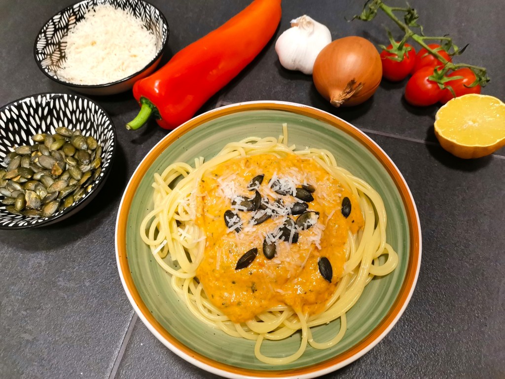 Die Sauce nun mit Salz, Pfeffer und Zitronensaft abschmecken. Pasta/ Gnocchi mit der Sauce servieren, mit Kürbiskernen und Parmesan toppen und genießen.
