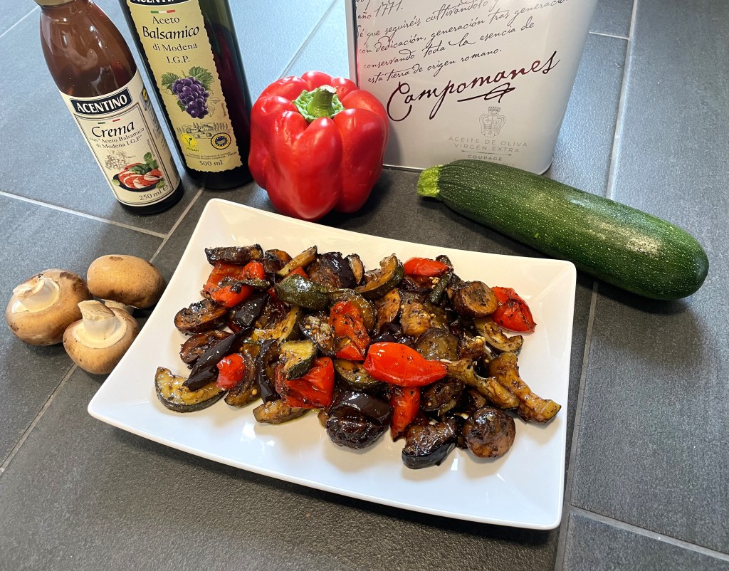 Alles Gemüse in eine große Schüssel geben den gehackten/gepressten Knoblauch dazu geben. Gewürze, Olivenöl, Balsamico und Balsamicocrema ebenfalls dazu geben und alles gut vermischen.