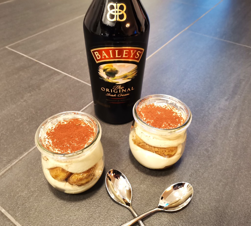 Zunächst wird die Creme angerührt. Hierfür Mascarpone, Quark, Zucker, Vanillezucker und Baileys mit dem Rührgerät zu einer glatten Creme rühren. Nun kann das Dessert schon in Gläser geschichtet werden. Hierfür je 1 Löffelbiskuit kurz von beiden Seiten in den Kaffee dippen, halbieren und in das Glas legen. Mit etwa 3-4 cm Creme bedecken. Wieder mit einem kaffeegetränkten Löffelbiskuit toppen. Erneut mit Creme bedecken. Dünn mit Backkakao bestreuen. Die Gläser bis zum servieren im Kühlschrank lagern.