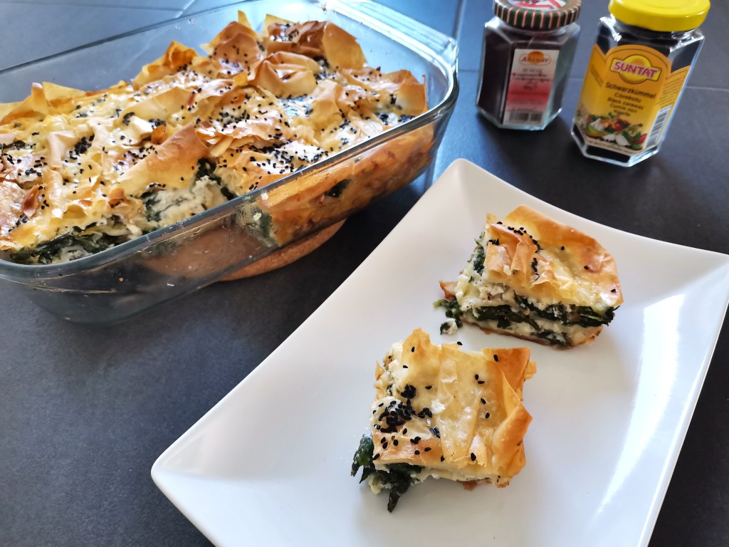 Nun geht es ans Schichten. Ganz Wichtig: Den Teig ruhig faltig und „unordentlich“ lassen. Dadurch kann sich die Flüssigkeit gut verteilen und der Börek wird schön saftig! Zunächst eine Schicht Filoteig bilden. Ich habe dazu 3 Filo-„Platten“ genommen und diese faltig aneinander gelegt. 1/2 vom Spinat und Feta darauf verteilen. Etwas Sumach darüber streuen. Nun 1/3 der Flüssigkeit gleichmäßig darauf verteilen. Eine weitere Schicht Filo darauf platzieren. Den restlichen Spinat und Feta darauf verteilen. Wieder mit etwas Sumach bestreuen und 1/3 der Flüssigkeit gleichmäßig verteilen. Mit dem restlichen Filoteig die Schlussschicht bilden. Hierauf die restliche Flüssigkeit gleichmäßig verteilen und ca. 2 TL Schwarzkümmel über dem Teig verstreuen.