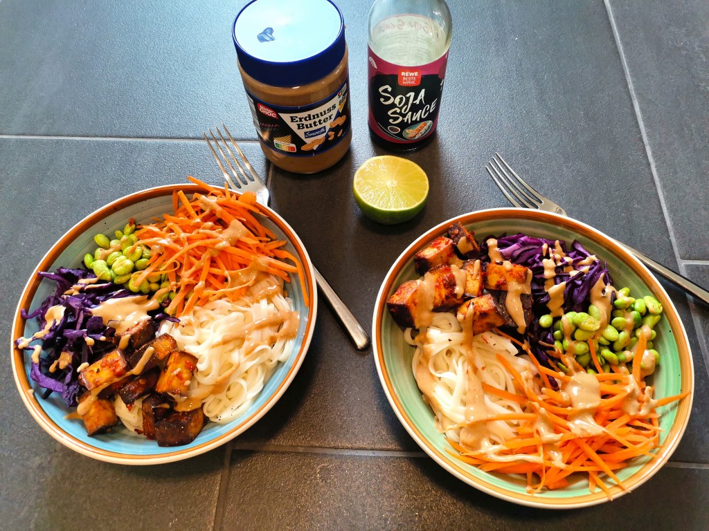 Eine herrlich leichte Bowl mit frischem Gemüse, knusprig gebackenem Tofu und einer cremigen Erdnusssauce. Schnell gemacht und perfekt für leichte Sommerabende. Was die Gemüseauswahl angeht kann man natürlich herrlich variieren. Ich finde die Kombination aus Möhren, Rotkohl und Edamame perfekt. Aber natürlich passen auch Salatguke, frische Sprossen oder auch Paprika perfekt zu der Bowl.