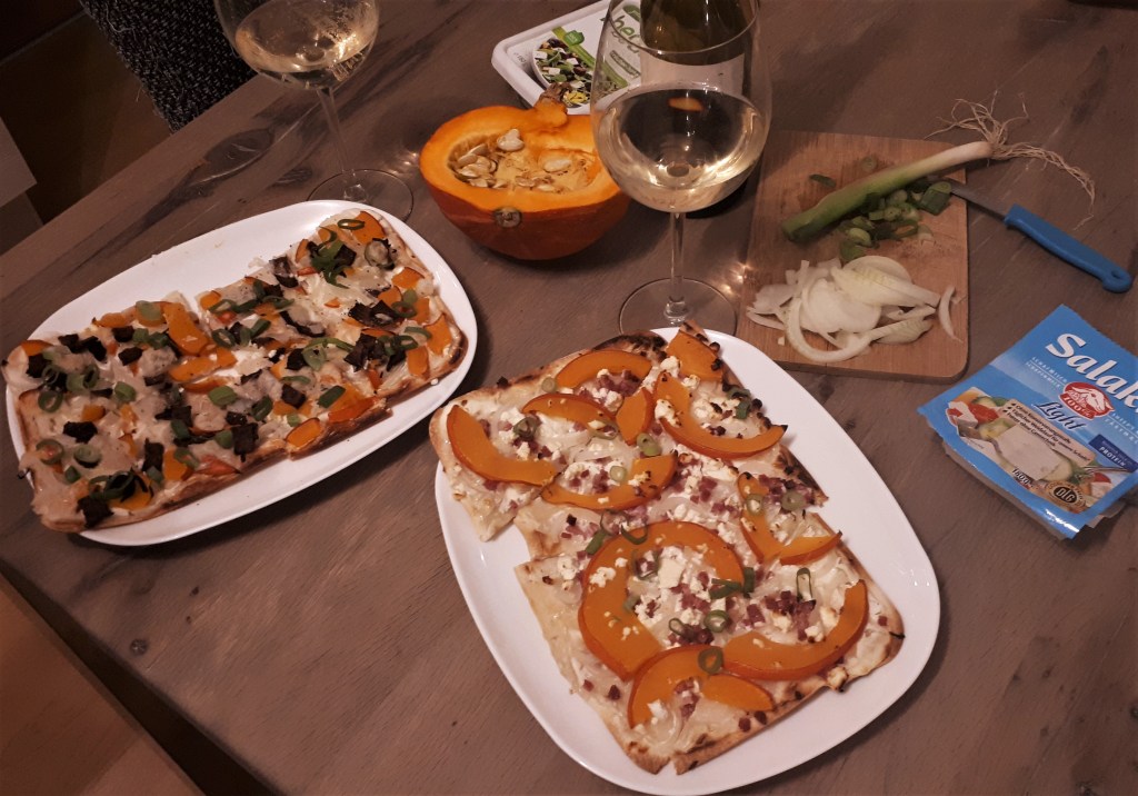 Herbstzeit ist offizielle Kürbiszeit und irgendwie auch Flammkuchenzeit denn viel Obst und Gemüse, welches im Herbst Saison hat, lässt sich prima mit Flammkuchen kombinieren. Egal ob Flammkuchen mit Birne (https://sophiesschlemmertempel.blog/flammkuchenmitbirne/), mit Apfel oder eben herzhafter Flammkuchen mit Kürbis. Zugegeben…Kürbis auf Flammkuchen das klingt schon ein wenig gewöhnungsbedürftig. Schmeckt aber unfassbar gut. Gerade in Kombination mit dem würzigen Speck und Feta wird das Ganze herrlich rund. Man kann den Speck übrigens auch guten Gewissens weglassen und den Flammkuchen so vegetarisch gestalten. Oder man macht das ganze wie meine Mitbewohnerin (Flammkuchen links im Bild) als vegane Variante mit Creme Vega, veganem Feta und veganem Bacon.