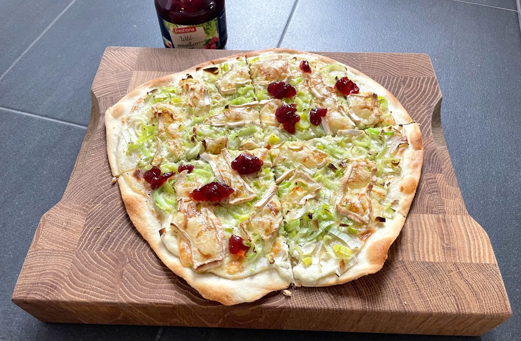 Eine schöne Herbstvariation für Flammkuchen: saftiges Lauch, herrlich deftiger Camembert und wer dem Ganzen das i-Tüpfelchen aufsetzen will, der packt noch etwas Preiselbeer Marmelade dazu. Unheimlich simpel und herrlich schmackhaft. Egal ob als vollständige Mahlzeit oder als kleiner Snack für einen geselligen Abend. Perfekt auch im Herbst zu Federweißem oder einem guten Gläschen Weißwein.