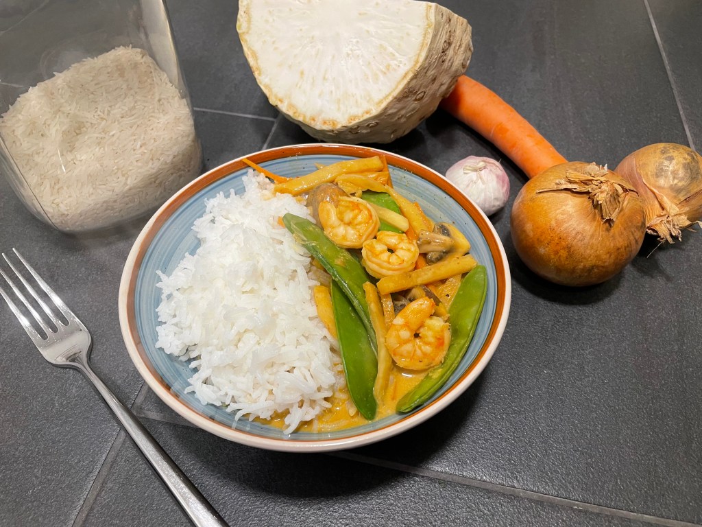 Für mich passt zu den Garnelen wunderbar die Kombination aus Knollensellerie, Möhre, Kaiserschoten und Champignons. Dazu rote Currypaste und Kokosmilch und schon ist das Curry quasi fertig.