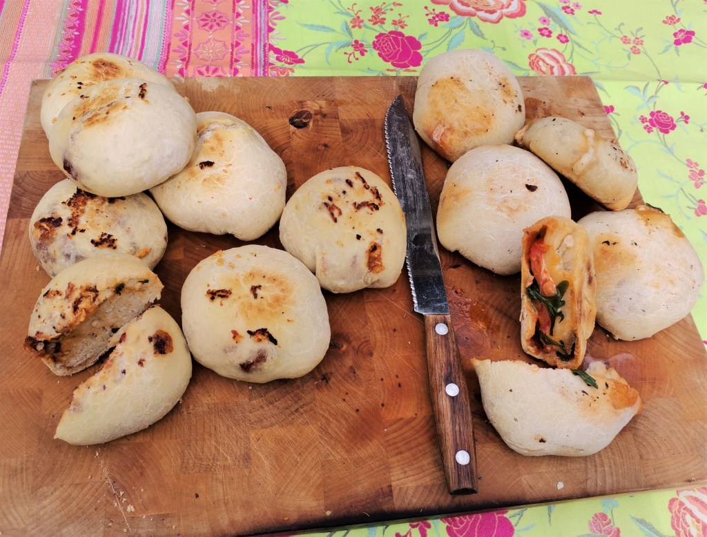 Für die italienische Variante wird wie folgt gefüllt: zunächst etwas Pesto in der Mitte des Fladens verteilen. Darauf Ruccola, 1-2 Tomatenscheiben und Mozzarella geben. Den Mozzarella mit etwas Salz und Pfeffer würzen. Den Rand mit etwas Wasser bestreichen und vorsichtig zur Mitte der Füllung hin ziehen, sodass der Teig eine geschlossene Kugel bildet. Die entstandenen Teigüberlappungen hierbei gut verschließen.