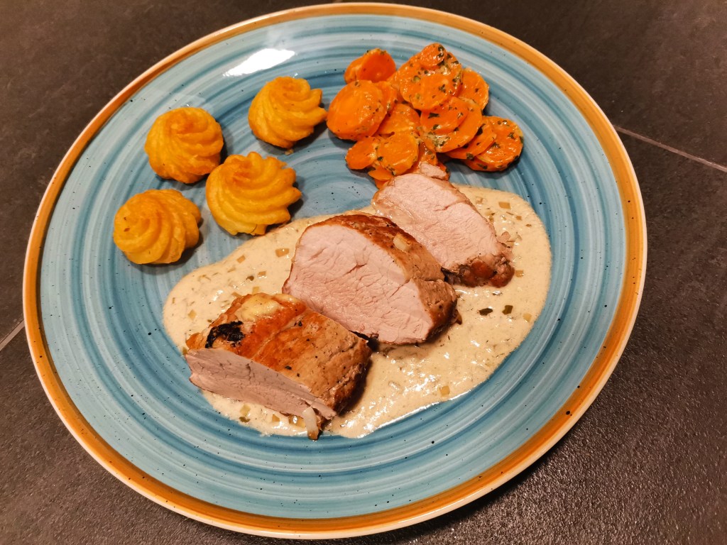 Das hier ist mein mit Abstand liebstes Rezept zur Zubereitung von Schweinefilet. Zwar ist die Variante im Speckmantel auch unheimlich lecker, aber nichts übertrifft die Kombination aus Knoblauch und Käse. Dazu die Estragon-Rieslingrahm Sauce – mein Alltime Favorite unter den Saucen. Was das Ganze quasi perfekt abrundet, ist der geringe Aufwand den man benötigt, bis das Filet schlussendlich im Ofen gart und die Sauce leise vor sich hin köchelt.