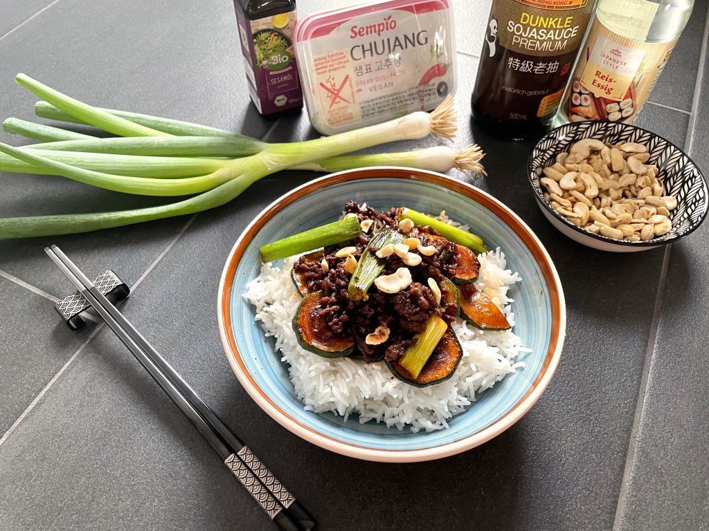 Den Reis waschen und so einen Teil der Stärke heraus lösen, nach Packungsanweisung kochen. Parallel Sesamöl in einer Pfanne erhitzen und das Hackfleisch scharf anbraten. Wenn das Hackfleisch etwas Farbe hat die Marinade dazu geben und das Ganze unter gelegentlichem Rühren bei mittlerer Hitze weiter braten. Eine zweite Pfanne ohne Öl erhitzen. Die Cashews anrösten, grob hacken und bei Seite stellen. In der gleichen Pfanne nun etwas Sesamöl erhitzen und die Zucchini scharf anbraten. Mit 1 EL Reisessig und 1 EL Sojasauce ablöschen und bei mittlerer Hitze weiter braten. Ein paar Minuten bevor der Reis fertig ist den Knoblauch in die Pfanne mit dem Hackfleisch pressen und die Frühlingszwiebel dazu geben. Hitze nochmal hochstellen und die Frühlingszwiebel angaren.