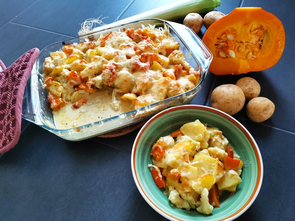 Die Kartoffeln schälen und in dünne Scheiben schneiden -wie bei einem Kartoffelgratin-. Den Hokkaido waschen, entkernen und ebenfalls in dünne Scheiben schneiden. Den Blumenkohl waschen und in kleine Röschen teilen. Den Lauch in Ringe schneiden und waschen. Den Knoblauch schälen und fein hacken/ pressen. Den Käse grob reiben.