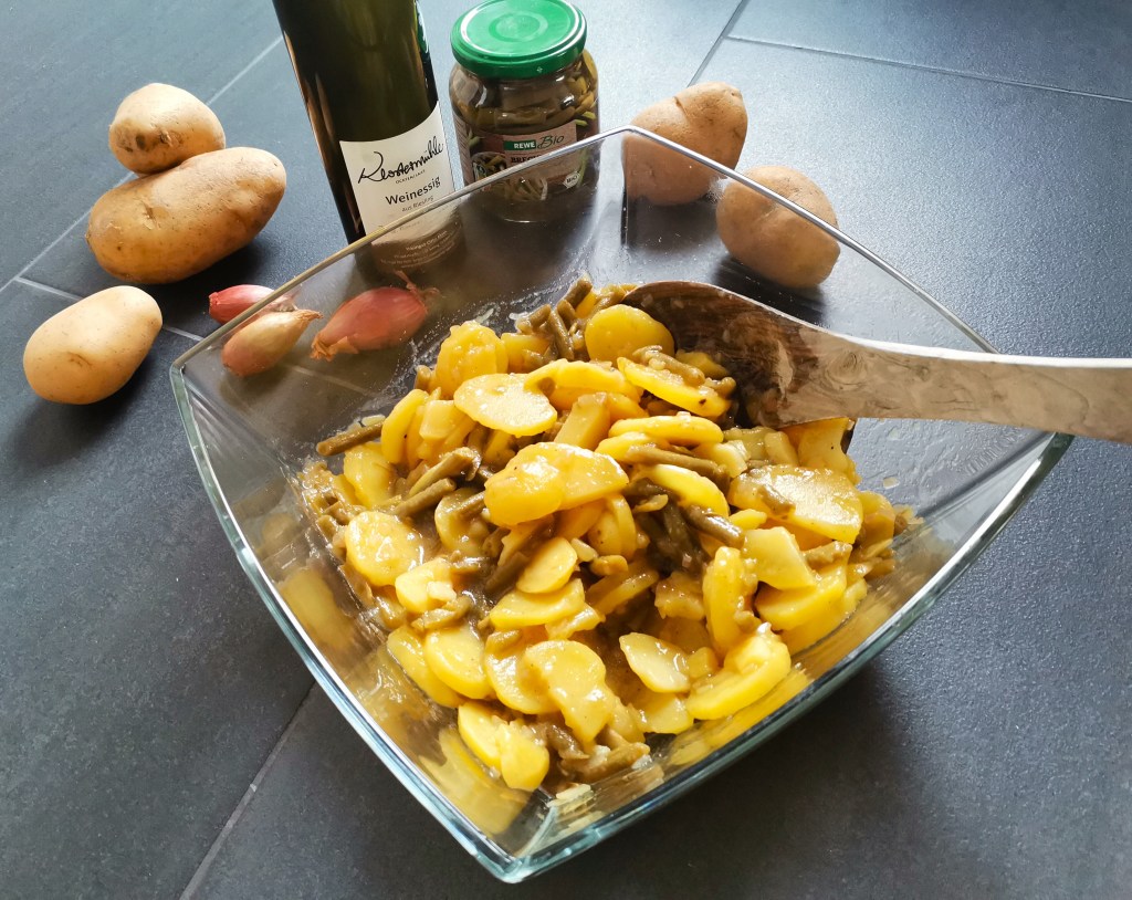 Meiner Meinung nach geht im Sommer, bei heißen Temperaturen nichts über einen herrlichen, leichten Kartoffelsalat. Da kommt der Kartoffelsalat mit Bohnen wie gerufen. Damit der Salat so herrlich unkompliziert zu machen ist, greife ich für das Rezept auf Brechbohnen zurück. Hier einfach 1-2 Gläser nehmen je nach gewünschtem Verhältnis von Bohnen zu Kartoffeln. Alles was es dann noch braucht, ist klassisches Grillgut, Würstchen, Leberkäse oder ein Schnitzel und fertig ist das Essen auch schon.