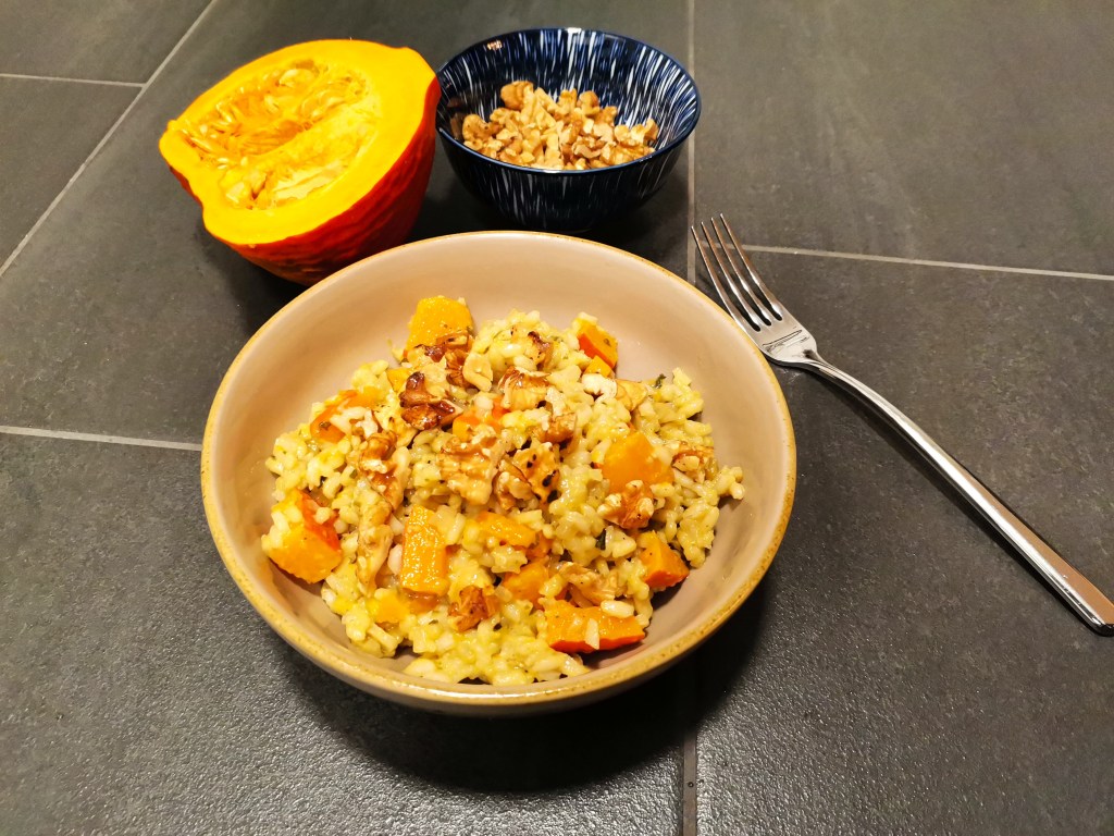 Kürbis ist einfach unglaublich vielseitig, egal ob süßes oder herzhaftes Gebäck als Kürbiskuchen oder Kürbismuffins mit Feta und Walnuss oder doch als leckere Beilage oder Suppe. Es gibt einfach nichts, das man mit Kürbis nicht machen kann. Das Kürbisrisotto bringt noch einmal eine schöne Variation rein. Ein cremiges Risotto mit der leichten Säure vom Wein, dem würzigen Gorgonzola, leckerer Kürbis und darauf noch lecker-knackige, geröstete Walnüsse. Einfach eine geniale Kombination und noch dazu unfassbar leicht und schnell gemacht.