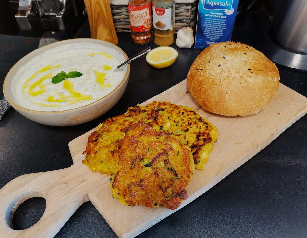 Die Linsen nach Packungsanleitung gar kochen. In der Zwischenzeit Zucchini und Karotte waschen und grob raspeln. Die Knoblauchzehen schälen und pressen. Zucchini, Karotte und Knoblauch in eine Schüssel geben. Alles Salzen und 5 Minuten stehen lassen. Anschließend das gesalzene Gemüse auswringen und die Flüssigkeit weg gießen (das ist nötig, da das Gemüse sonst zu sehr wässert und die Masse sich später nicht gut backen lassen würde). Die fertig gekochten Linsen gut absieben und in die Schüssel geben. Die Eier dazu geben und alles gut vermsichen. Nun das Mehl nach und nach dazu geben. So viel Mehl nehmen, dass eine formbare Masse entsteht. Die Masse nun mit Salz Pfeffer, Chili Flocken und je 1 TL Kreuzkümmel und Currypulver würzen.