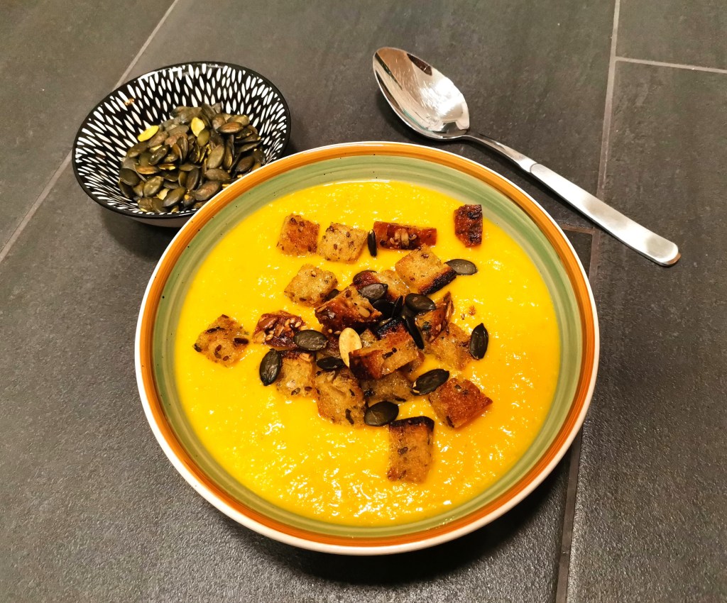 Als kleines aber feines Topping wird die Suppe mit selbstgemachten Knoblauch-Croutons verfeinert. Diese eignen sich übrigens prima als Resteverwertung für übrig gebliebenes Brot, Toast, Baguette oder Brötchen. Einfach nehmen was da ist, in würfel schneiden, marinieren und anbraten.