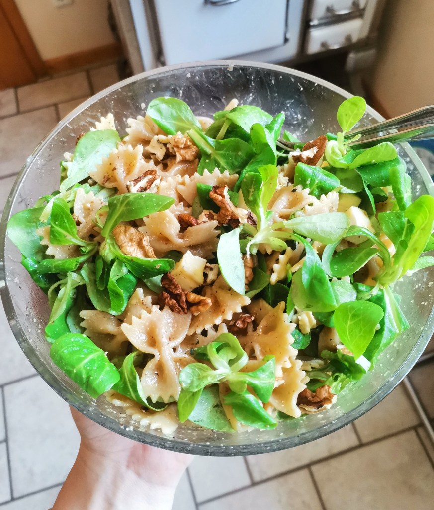 Ein schneller, leichter Nudelsalat mit knackigen Nüssen, einem würzigen Dressing und frischem Feldsalat. Super easy, super lecker. Perfekt für den nächsten Grillabend oder auch für die Mittagspause. Der Nudelsalat mit Honig-Senf-Dressing ist der optimale Begleiter beim Grillen zu sämtlichen Grilgut, da er eben als Beilage etwas im Hintergrund bleibt und nicht erschlägt mit intensiven Aromen.