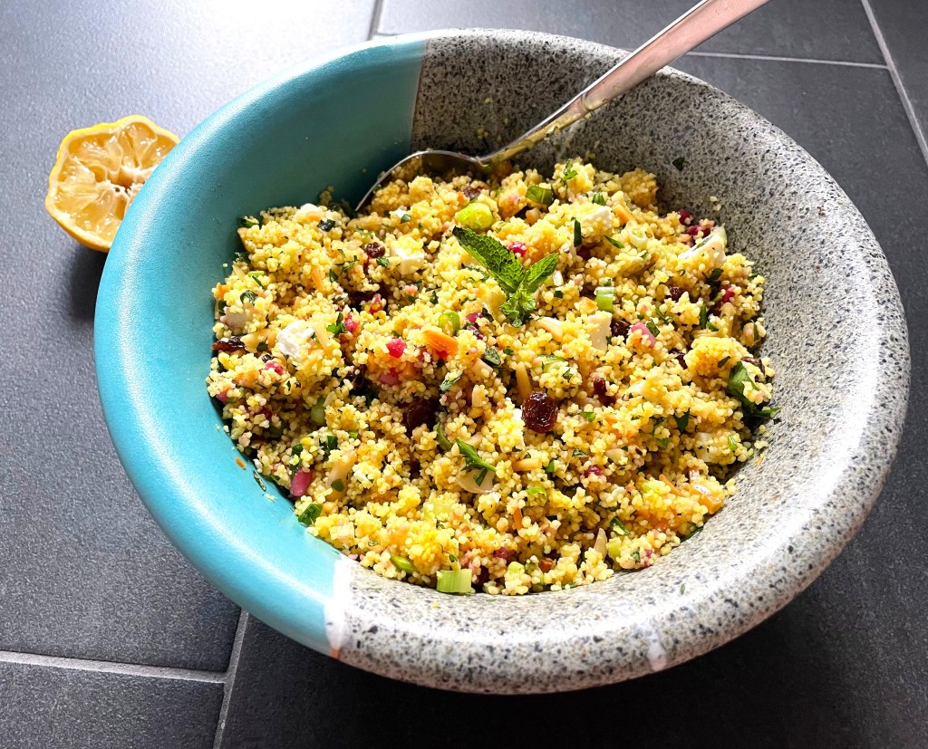 Minze und Petersilie waschen und fein hacken. Die Frühlingszwiebel waschen und in dünne Ringe schneiden. Die Mandelsplitter in einer Pfanne ohne Fett anrösten. Den Feta in kleine Würfel schneiden. In einer großen Schüssel Minze, Petersilie, Frühlingszwiebel, Mandelsplitter, Feta, Rosinen und Granatapfelkerne vermischen. Den fertig gequollenen Couscous nochmals mit der Gabel auflockern und zu den restlichen Zutaten geben. Mit dem Saft einer halben Zitrone und dem Olivenöl vermischen und nochmals abschmecken. Bei Bedarf mit Salz und Cayennepfeffer nachwürzen.
