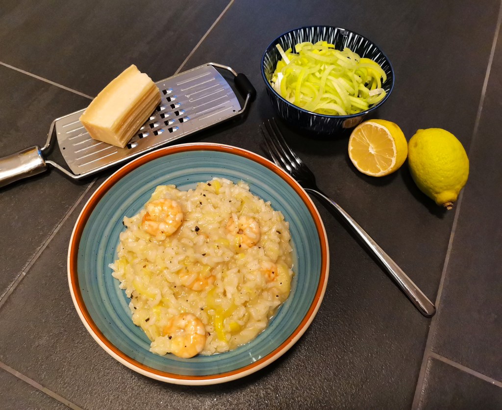 Den Lauch in feine Ringe schneiden und waschen. Parmesan grob reiben. Die Butter in einem größeren Topf schmelzen und die Garnelen darin von beiden Seiten kurz anbraten. Garnelen rausnehmen und bei Seite stellen. In der Butter den Lauch andünsten. Risotto Reis dazugeben und für 2-3 Minuten anrösten. Mit dem Wein und dem Saft der Zitrone ablöschen. Zitronenabrieb ebenfalls in den Topf geben. Auf mittlere Temperatur runterschalten und nach und nach die Brühe dazugeben und einköcheln lassen (je nach Sorte des Risottoreis ca. 15-25 Minuten, Packungsanweisung beachten!). Zu guter Letzt, wenn der Reis gar ist den Parmesan und die Garnelen unterheben. Mit Salz, Pfeffer, Oregano und Basilikum abschmecken. Fertig ist das Risotto.