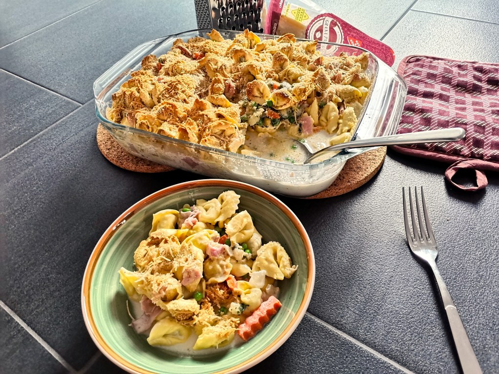 Heute gibt es ein weiteres Feierabend Rezept. Nach einem stressigen Tag muss es nun mal schnell gehen. Aber schmecken darf und sollte es trotzdem. Also bieten sich die Ofen Tortellini perfekt an. Natürlich kann man das Rezept auch vegetarisch gestalten und den Schinken weglassen. Wichtig für das Rezept: Nehmt eine tendenziell zu große Auflaufform. Die Tortellini sollten eine möglichst flache Schicht bilden, damit alle in der Sauce liegen und auch etwas durchziehen können. Nimmt man eine kleine Form in der die Tortellini zu hoch geschichtet sind, dann werden die oberen eher kross als gar.