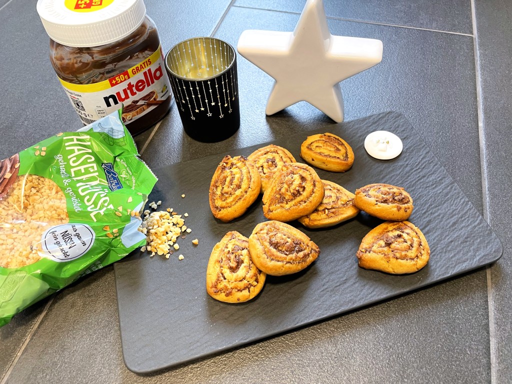 Den Teig rechteckig auf ca. 1 cm Dicke ausrollen. Die Schokocreme gleichmäßig auf dem ausgerollten Teig verteilen. Darauf die gehackten, gerösteten Haselnüssen verteilen. Nun wird der Teig aufgerollt. Ich habe hier 2 kleinere Rollen mit jeweils weniger „Umdrehungen“ gerollt, man kann aber auch eine dicke Rolle machen -abhängig davon wie groß die Plätzchen nachher werden sollen. Den Backofen auf 200° Ober-/ Unterhitze vorzeihen. Von der/ den Rolle/n nun ca. 2 cm dicke Scheiben abschneiden und diese auf einem Blech platzieren. Für 10-11 Minuten ausbacken. Auskühlen lassen und wegpacken.