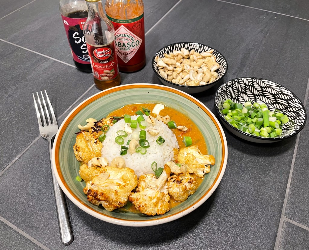 Eine unschlagbare Kombination aus pikanten, gebackenem Blumenkohl, einer würzigen Dal Sauce und das Ganze getoppt von knackigen Cashew Nüssen. Dazu ein wenig Reis oder Pfannenbrot. So entsteht ein wunderbares, gesundes Gericht, dass nicht nur die Vegetarier und Veganer überzeugt.