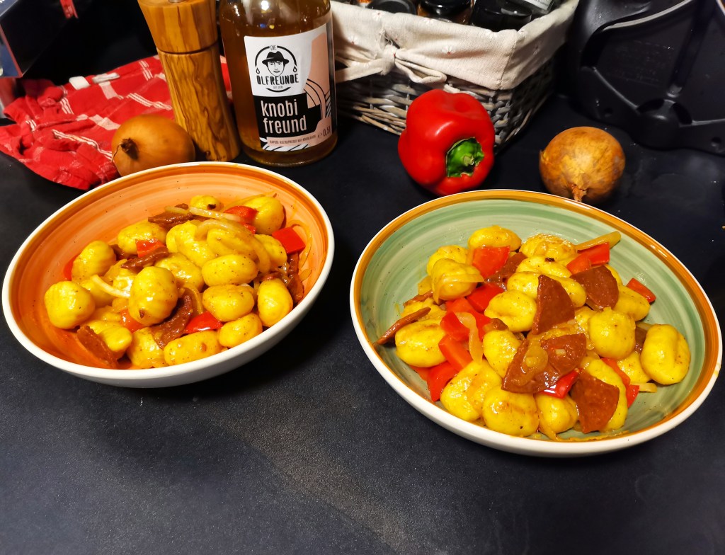 Aber die Sucuk lässt sich auch prima in Nudel- oder Gnocchigerichten verarbeiten. Deshalb habe ich mich an einer Kreation mit Gnocchi und etwas Gemüse versucht. Das Ergebnis ist zwar optisch nicht das große Highlight, schmeckt dafür aber umso besser.