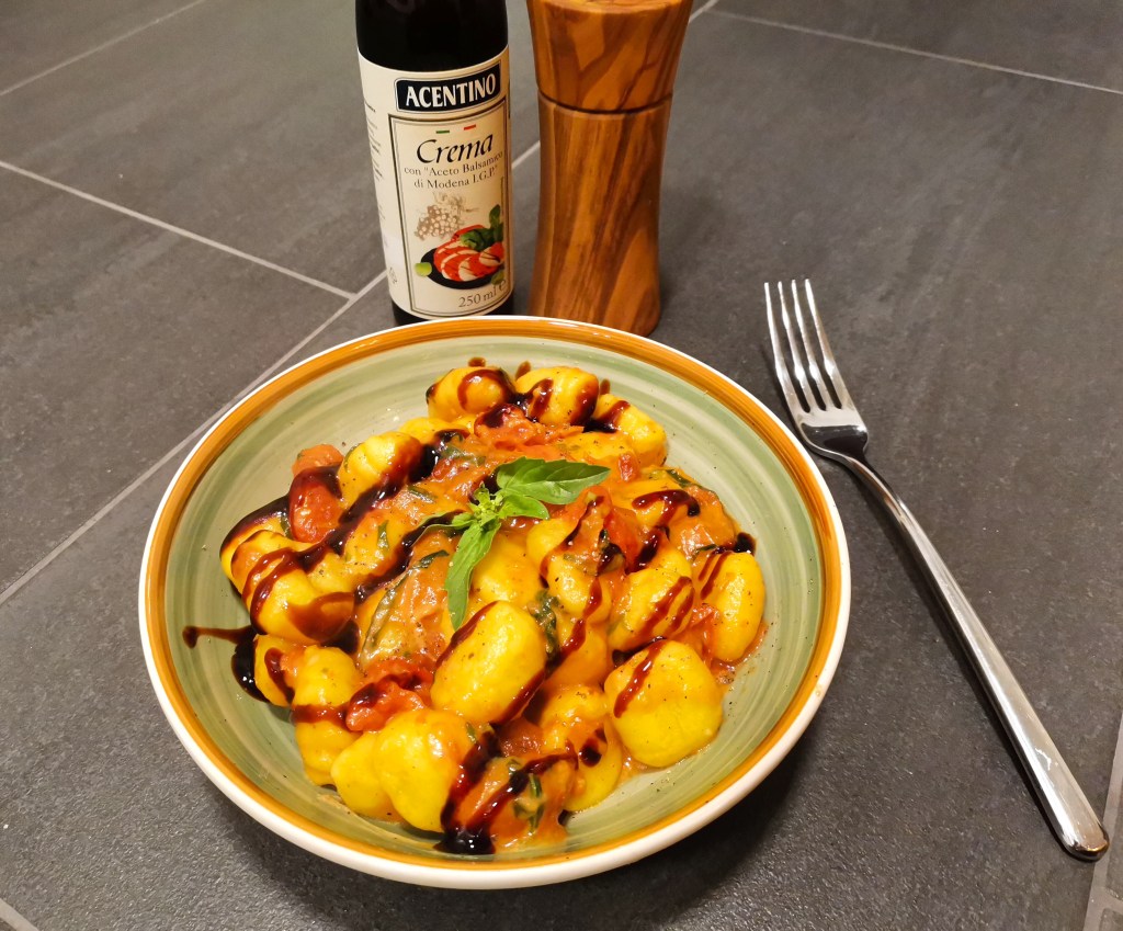 Die Gnocchi in einer beschichteten Pfanne goldbraun braten und bei Seite stellen. In einer Pfanne das Olivenöl erhitzen und die Tomaten darin für 5 Minuten schmoren. Dabei soll der Saft der Tomaten austreten. Das Basilikum und den Knoblauch dazu geben. Weitere 2 Minuten schmoren. Den Weißwein und den Mozzarella dazugeben. Den Mozzarella nun unter rühren in der Weißweinsauce schmelzen. Mit Salz und Pfeffer abschmecken. Die Gnocchi wieder dazu geben und unterrühren. Alles heiß mit etwas Balsamico Creme und frisch gemahlenem Pfeffer servieren.