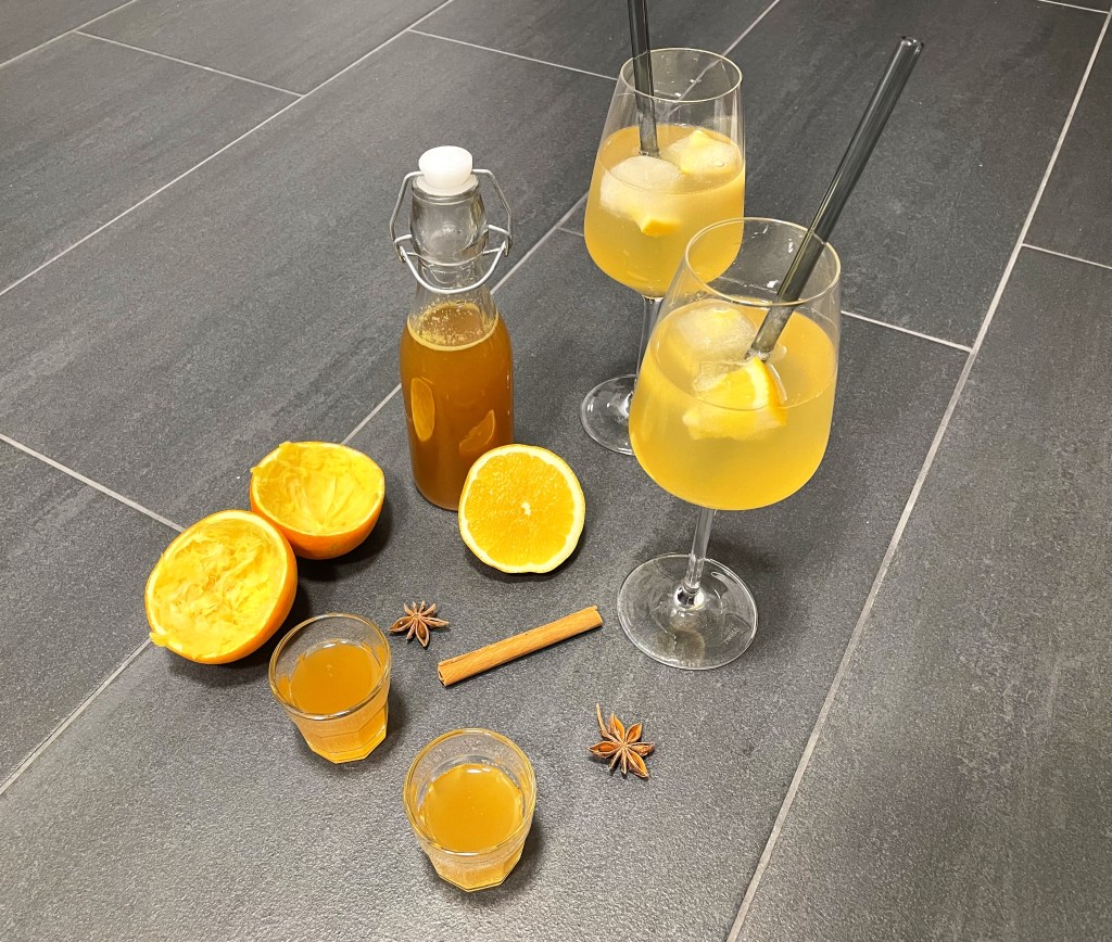 Die Orangen auspressen bis man etwa 250ml Saft abgemessen hat. In einem Topf Zucker und Orangensaft vermischen. Die Gewürze dazugeben und köcheln lassen, bis die Flüssigkeit um etwa 1/3 reduziert ist. Dabei regelmäßig umrühren und aufpassen, dass das Gemisch nicht überkocht! Die Gewürze rausfischen und den Orangensirup auskühlen lassen. Zu guter Letzt, wenn der Orangensirup abgekühlt ist, den Schnaps unterrühren. Alles in sterile, luftdicht verschließbare Flaschen abfüllen und dunkel und kühl lagern.