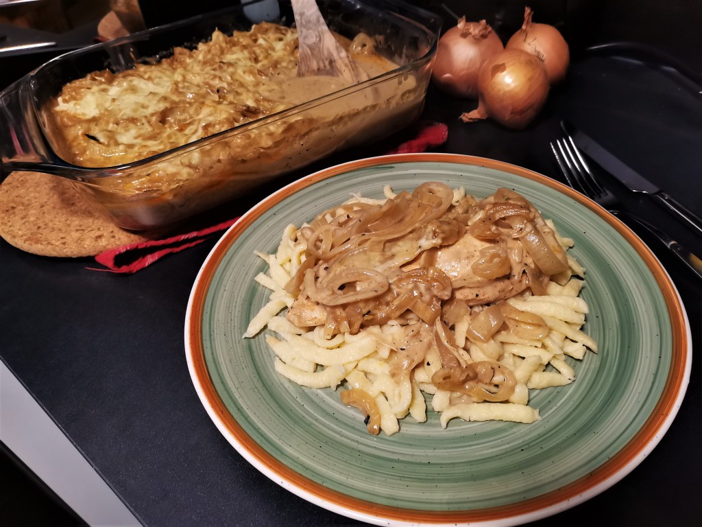 Ein absoluter Klassiker in der Küche ist das Zwiebel-Sahne Hähnchen. Aber auch hier gibt es wieder etliche Möglichkeiten, wie genau man das Rezept gestaltet. Für mein Rezept wird die Sahnesauce mit etwas Wein und Senf verfeinert. Das gibt der Sauce eine gewisse Würze und intensiviert den Geschmack. Das Beste an dem Rezept: es macht sich quasi von alleine. Wenig Aufwand, kaum Vorbereitung und die meiste Arbeit erledigt der Ofen. Was will man mehr? Zu dem Zwiebel-Sahne Hähnchen kann man nahezu alles servieren, egal ob Reis, Spätzle, Rösti oder Kroketten. Da kann man dem eigenen Geschmack freien Lauf lassen.